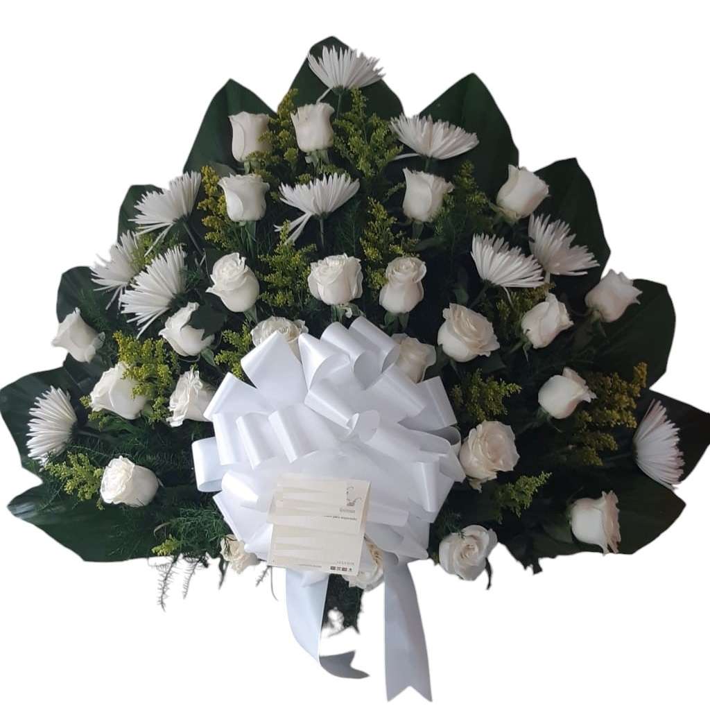 Abanico de rosas del color de su elección con cremones blancos y follaje variado. Incluye cinta y/o tarjeta