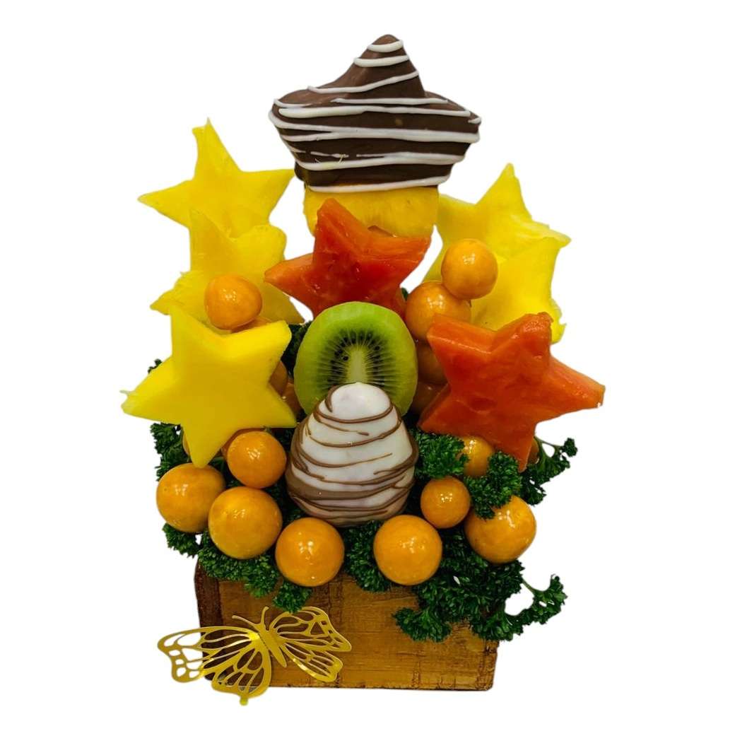 Base de madera con surtido de frutas (melón, uchuvas, uvas, fresa y kiwi) naturales y con chocolate.