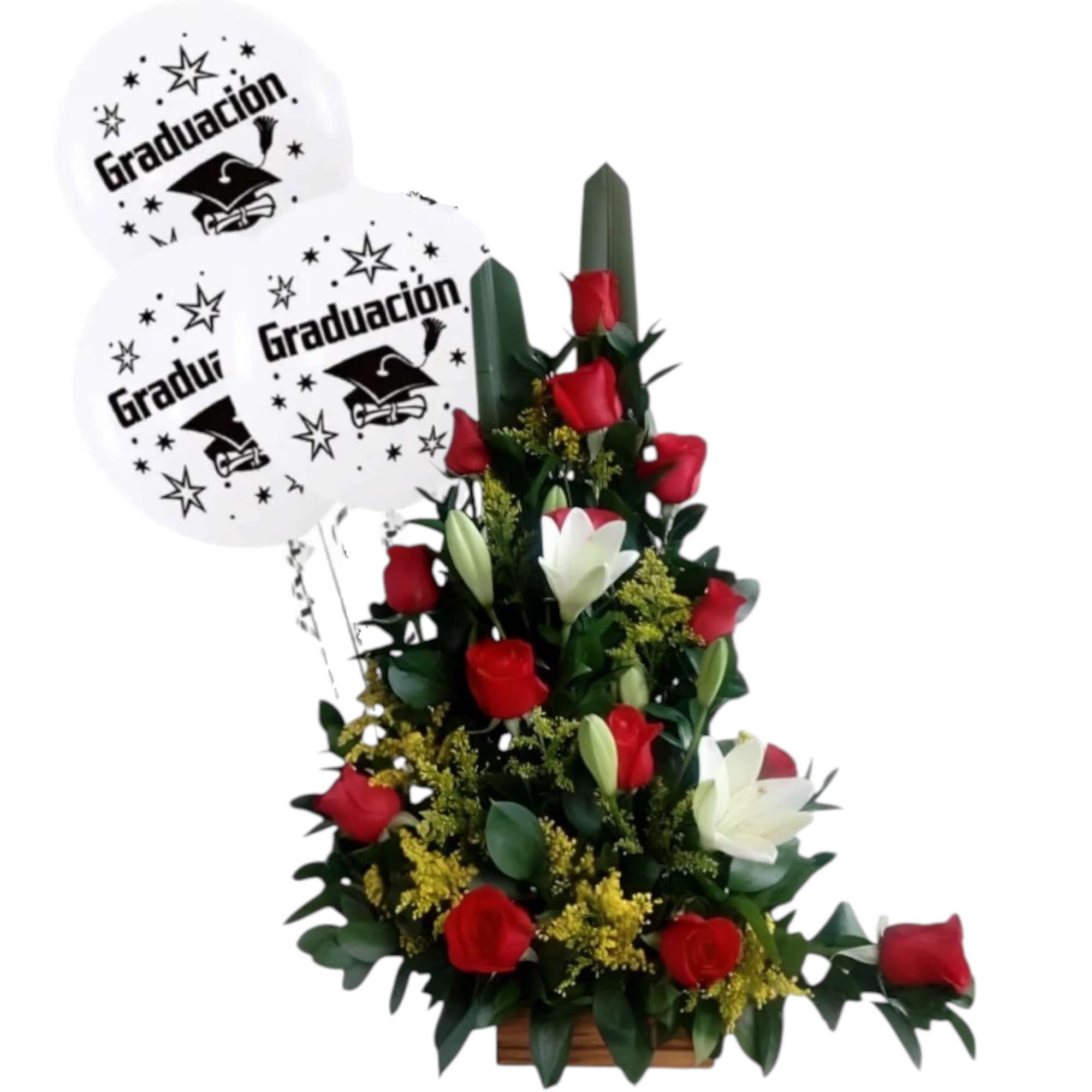 Hermoso diseño elaborado en base de madera con doce rosas y Lirios del Japón y 3 globos con helio