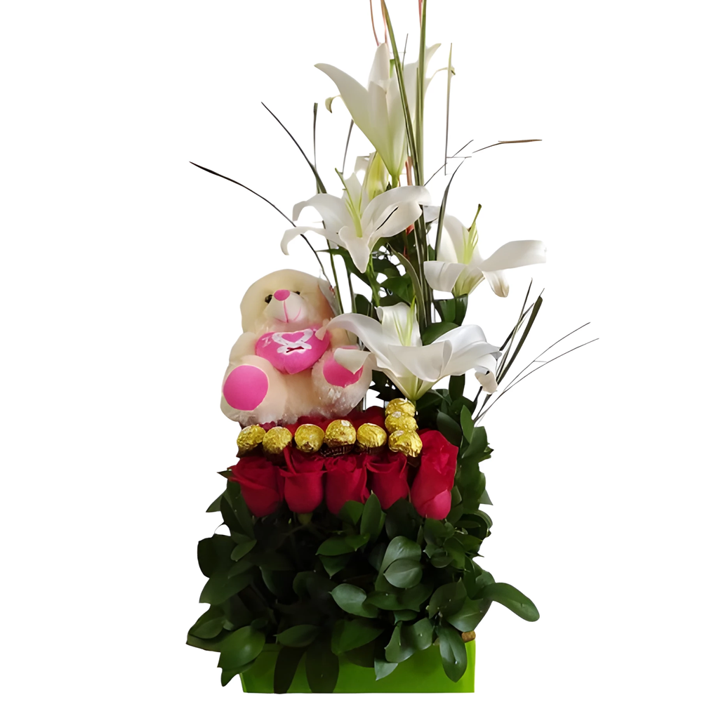 24 rosas de tu color favorito en base de madera con lirios, peluche y 8 chocolates Ferrero