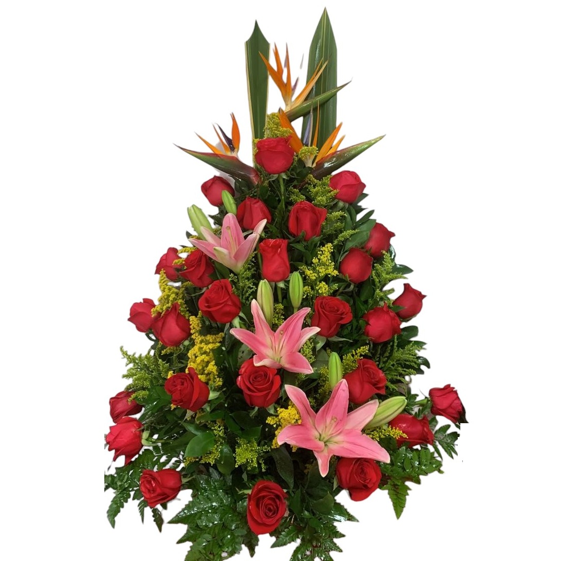24 bellas rosas en base de madera acompañadas de toque de flor exótica y lirios del Japón.