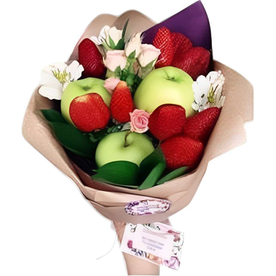 Bouquet de 3 manzanas, 10 fresas y astromelias, todo decorado con papel y moño