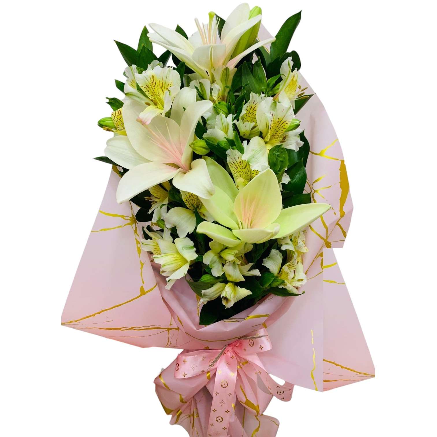 Bouquet de 3 lirios y 6 astromelias con papel coreano, moño y tarjeta