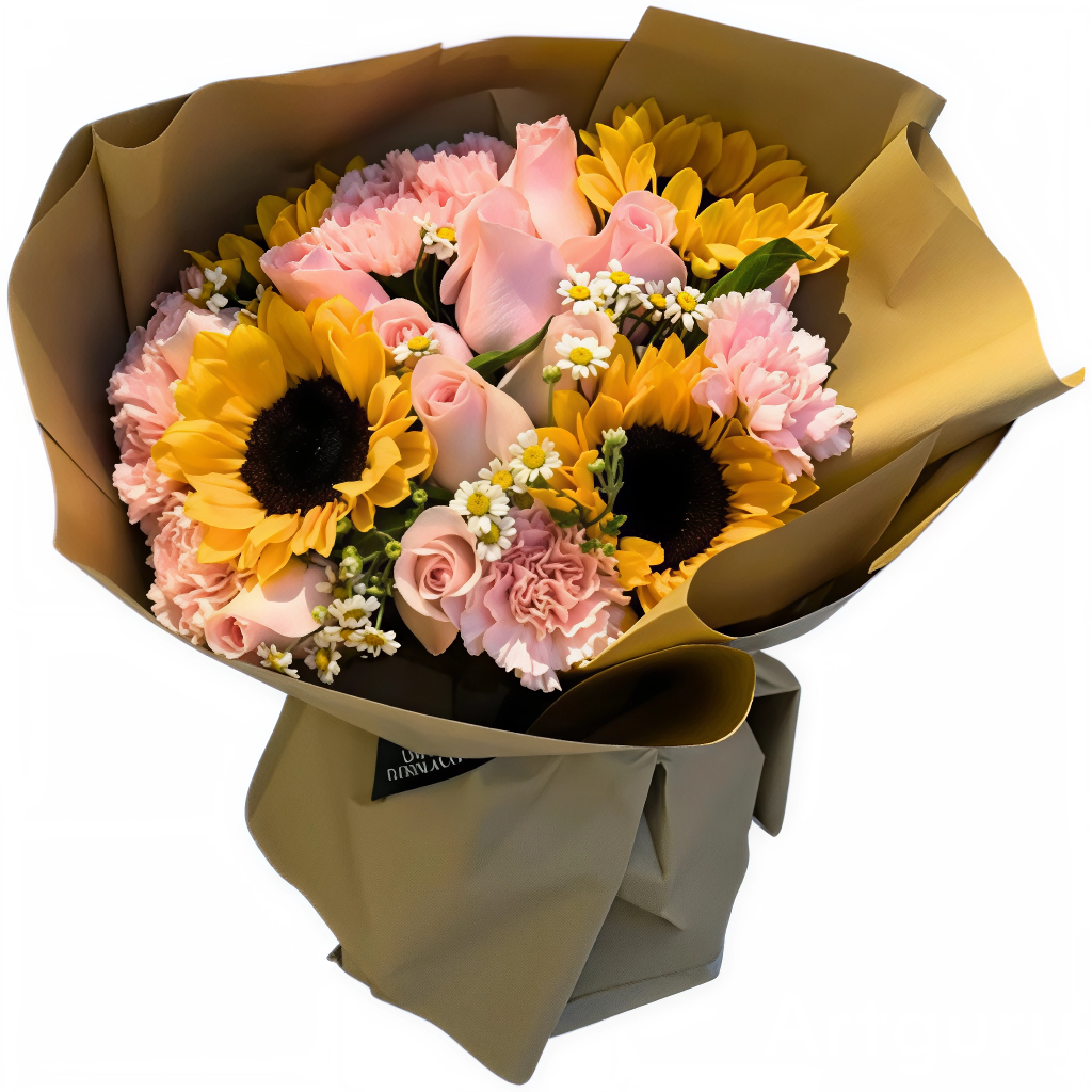 Bouquet de 4 girasoles, 12 rosas y claveles, con follaje blanco, papel coreano, moño y tarjeta.
