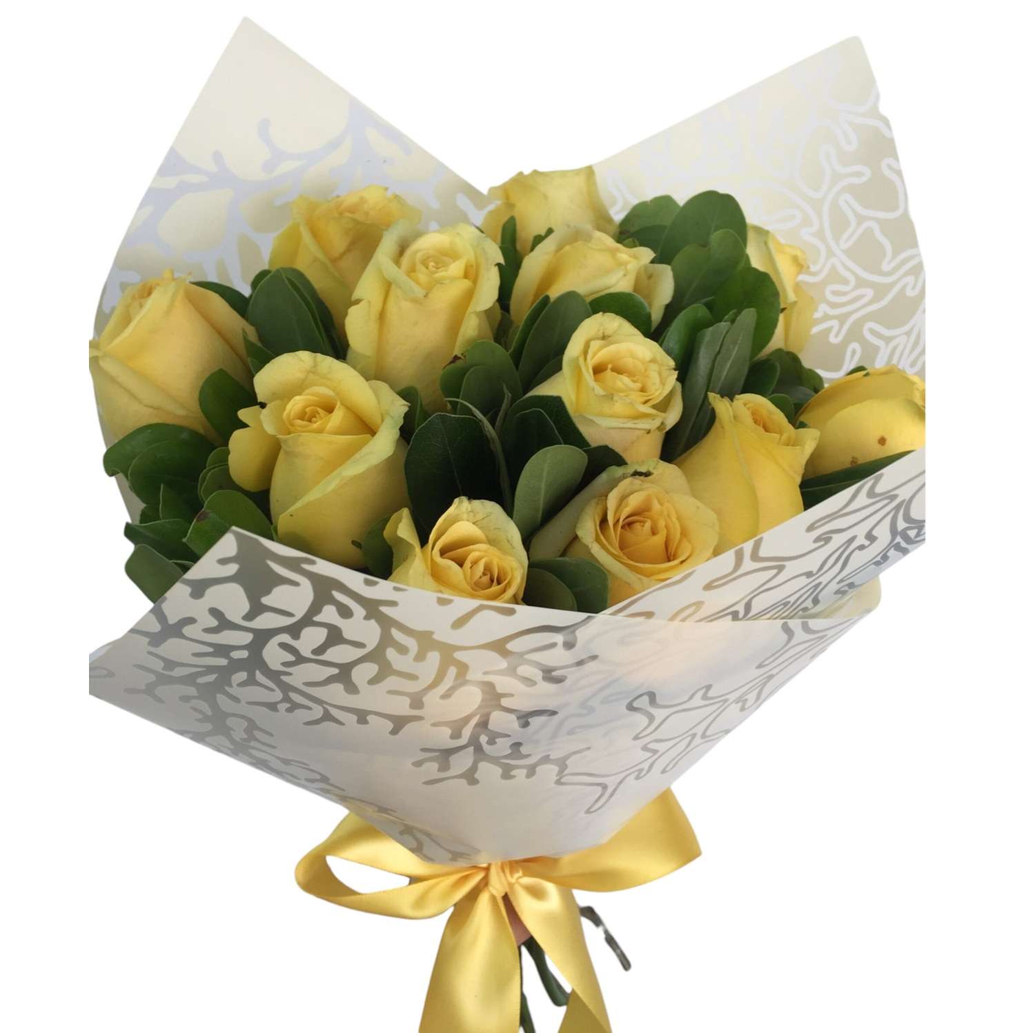 Diseño redondo de bouquet de rosas del color de su elección con follaje, moño, tarjeta y papel coreano