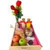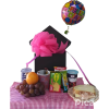 Caja con 4 pancakes con fruta (banano, fresas, kiwi), chocolate, decorado con un globo con helio, moño y tarjeta