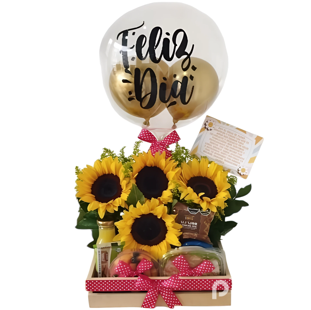 Base de madera decorada con arreglo de 4 girasoles, globo burbuja, porción de fruta picada, sándwich, galletas, jugo de naranja, brownie y yogurt