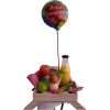 Canasta redonda con yogur griego, fruta picada, mug con café y azúcar, manzana, bon yurt. queso, jugo de naranja, sándwich, galletas, cereales, solitario con flores y globo