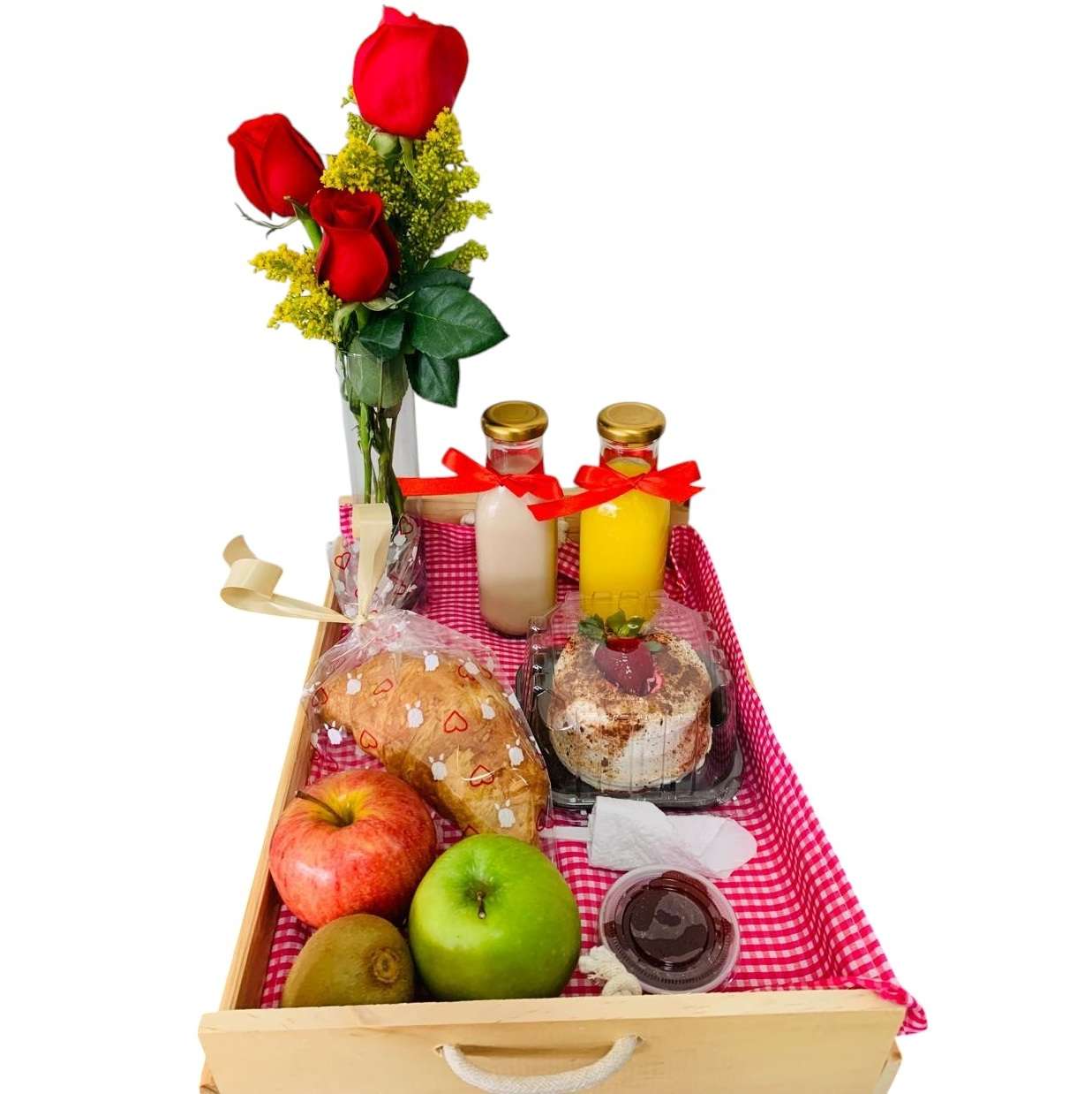 Base de madera con botella de jugo y de milo, 3 frutas enteras personales, pan, porción de mermelada, torta personal y solitario con rosas