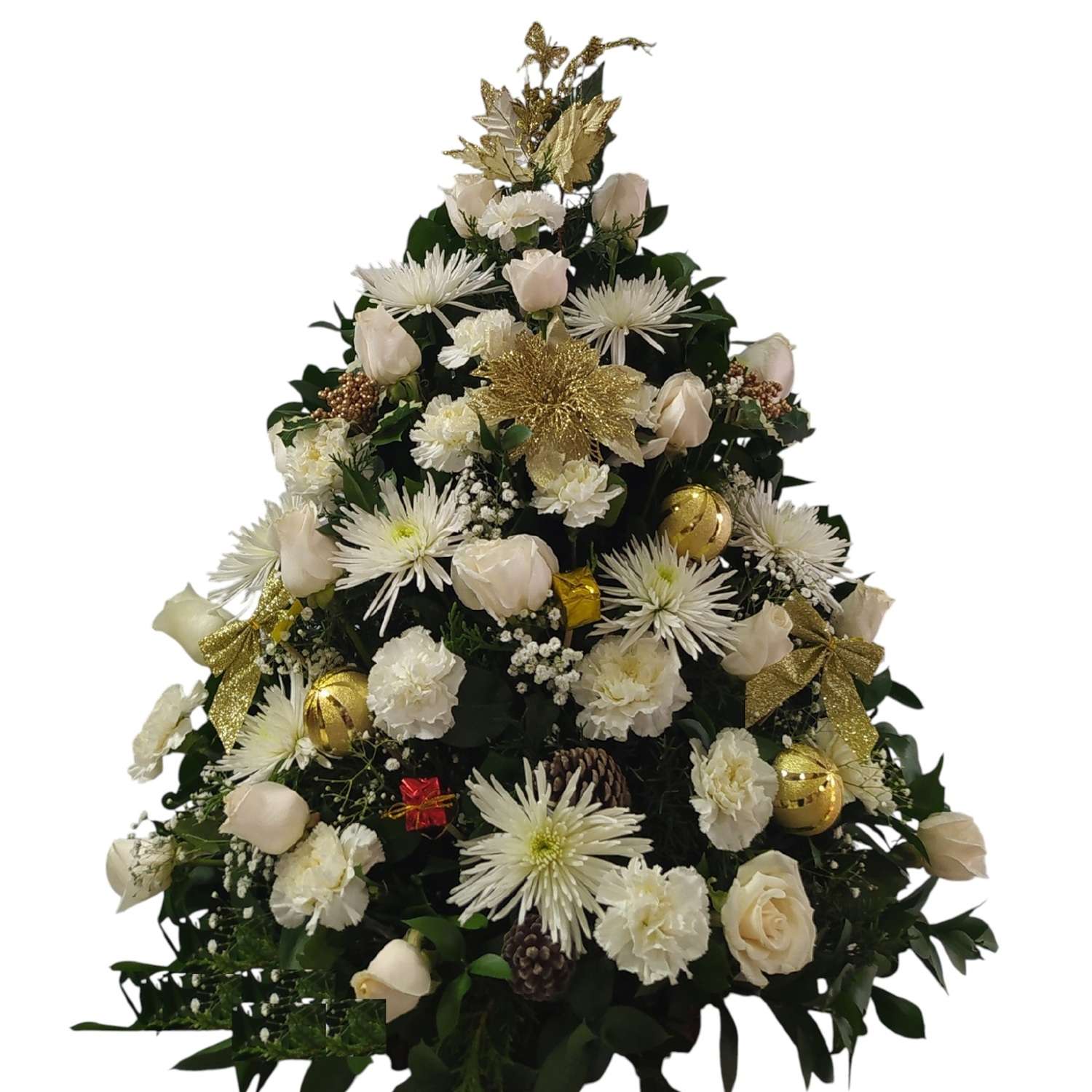 Arreglo floral con 24 rosas blancas, pompones y apliques navideños variados