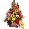 Arreglo de 9 girasoles, follajes variados, racimo de uvas y 5 frutas enteras personales