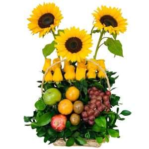 4 Frutas enteras personales, racimo de uvas, 2 girasoles y globo en base de madera decorada con moño y tarjeta