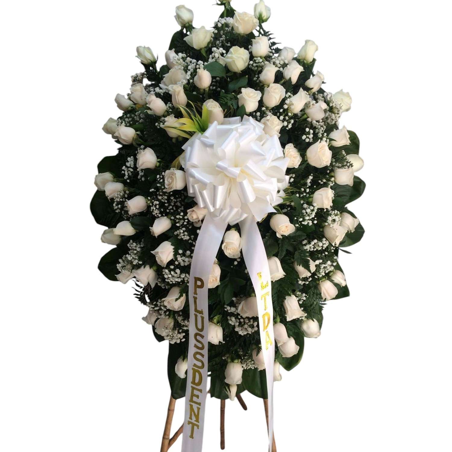 Pedestal con 50 rosas del tono de su elección, follaje, cinta y tarjeta
