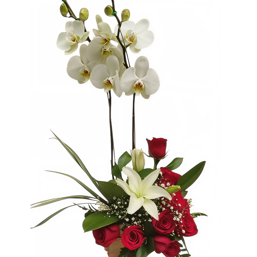 Planta de orquídea phalaenopsis en base de madera con 12 rosas, 1 vara de lirio, follajes variados, moño y tarjeta. Pregunte colores disponibles