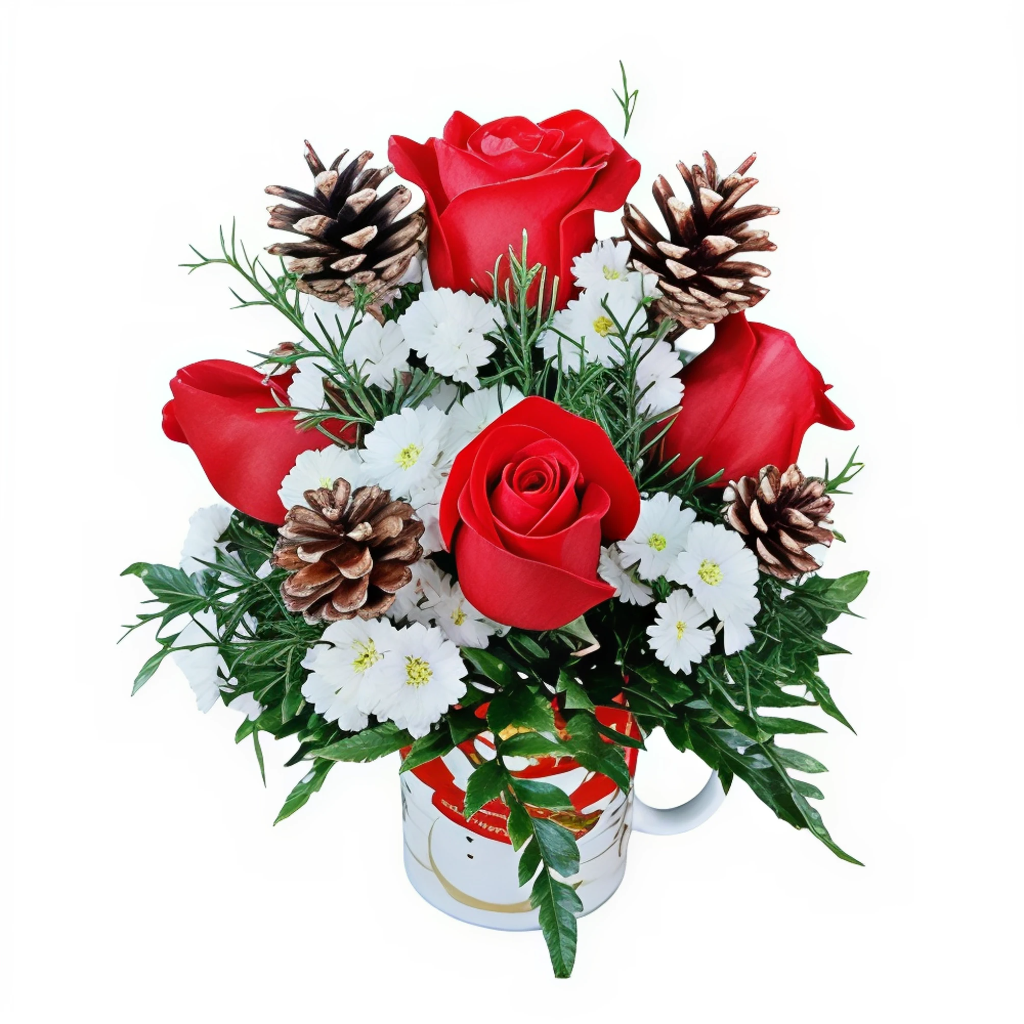 Arreglo redondo tipo centro de mesa con 7 rosas, flores miniatura blancas, piñas navideñas y follaje variado en pocillo con imagen alusiva (diseño sujeto a disponibilidad)