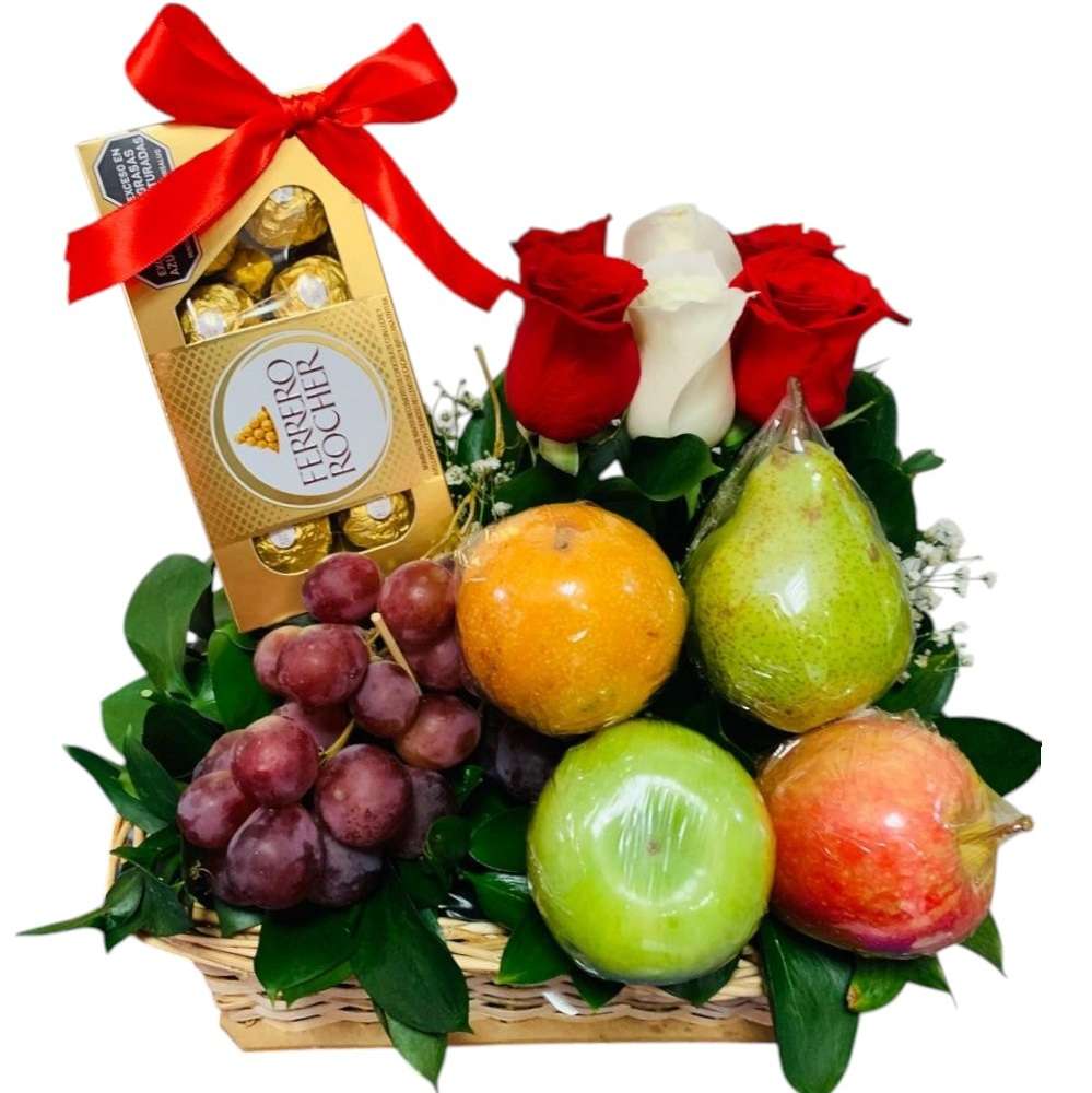 Canasta de 6 rosas, racimo de uvas, 4 frutas enteras personales, Ferrero x8 y follaje variado