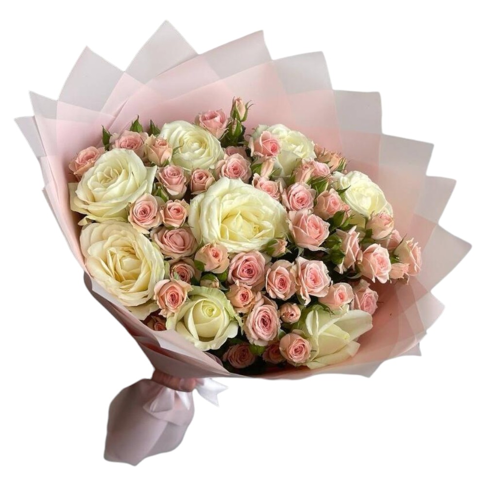 Bouquet x 12 rosas tradicionales y 10 tallos de rosas mini, con follaje variado, papel coreano, moño y tarjeta. Pregunte colores disponibles al día