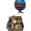 Ikebana de rosas y girasoles en bandeja con porción de fruta picada, sándwich casero, yogur, bon yurt, milo, maní, brownie, ponquecito, galletas y jugo litro con globo y mantel decorativo