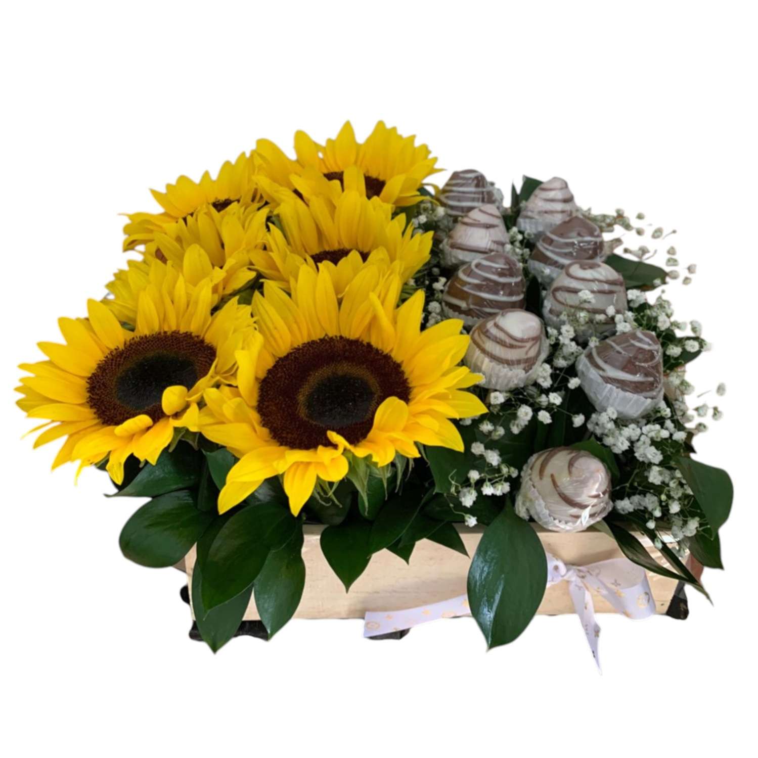Tapizado de 6 girasoles y 9 fresas con chocolate, en canasta, con follaje variado, moño y tarjeta