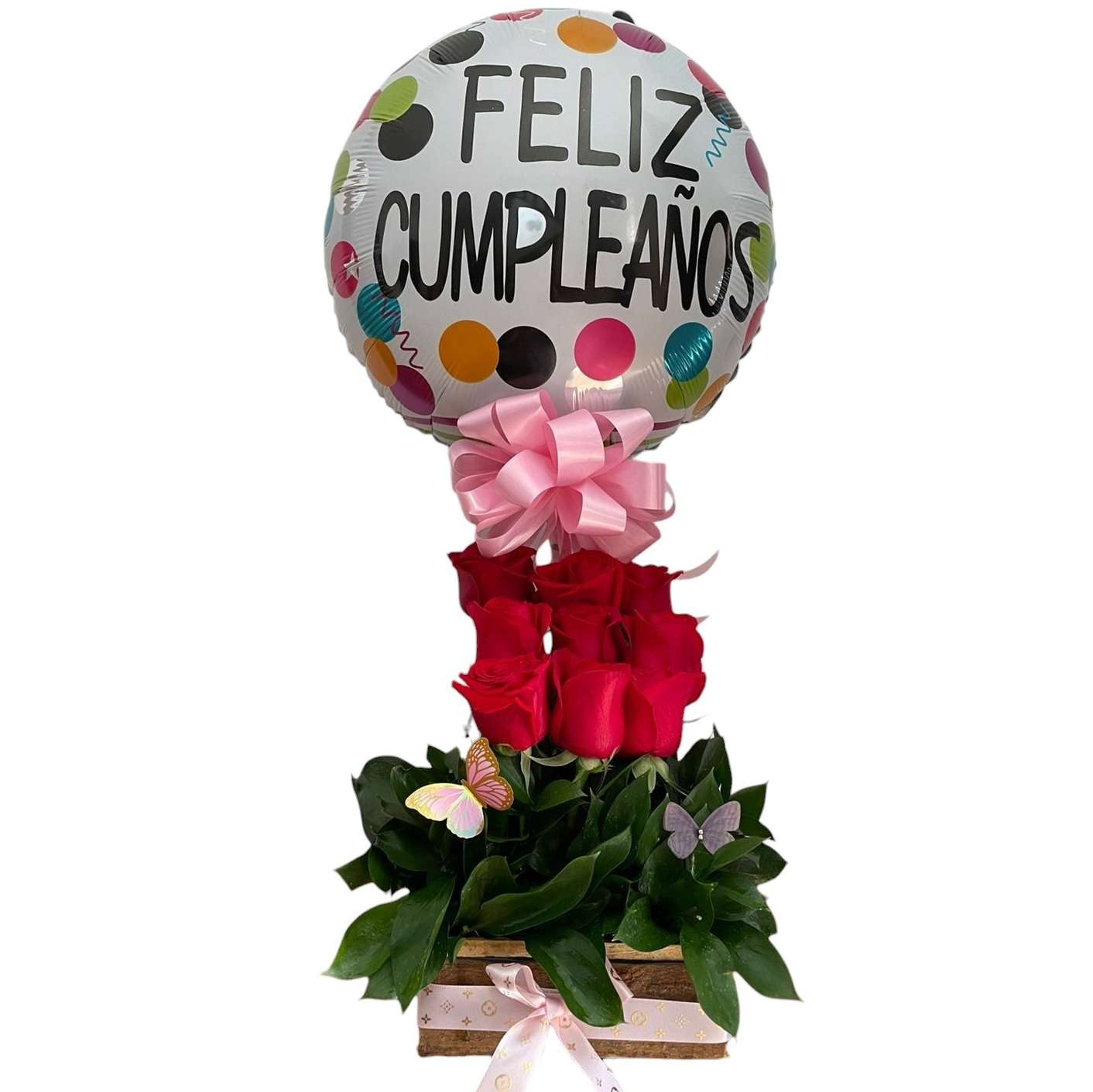 Tapizado de 9 rosas, con follaje variado, globo de 18 pulgadas y base de madera, con moño y tarjeta