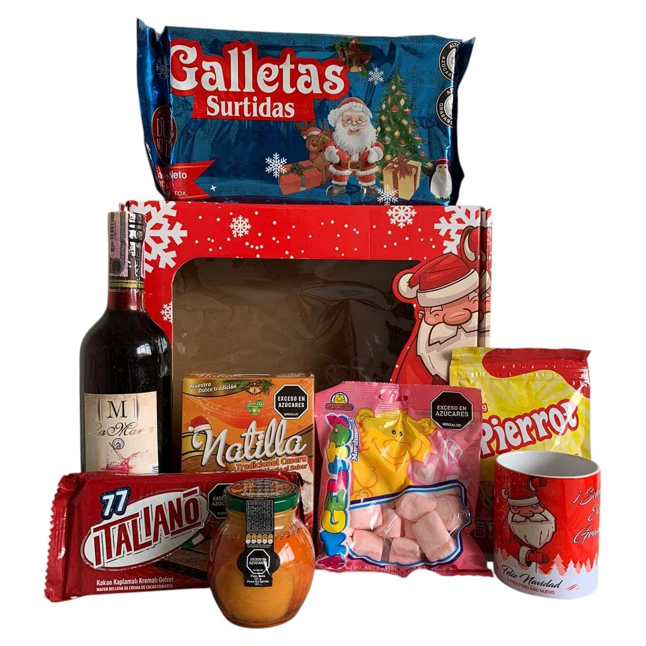 Caja decorativa con vino, galletas de navidad, caja de natilla, frasco de duraznos, masmelos, doy pack de maní, taco de galletas saltinas y pocillo